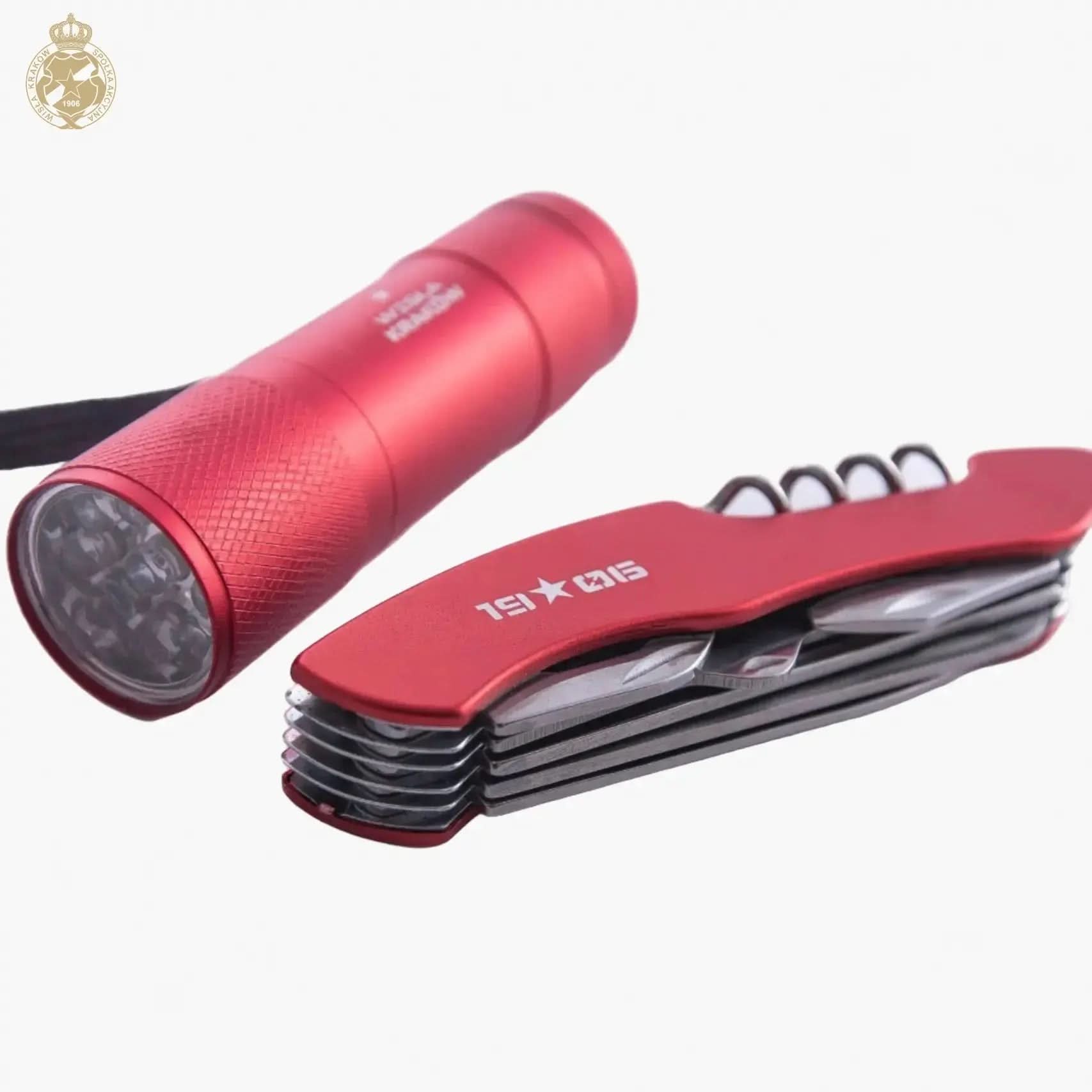 • 11-funkcyjny nóż multitool – wszechstronny zestaw narzędzi do szerokiego zakresu zadań, z centralnym motywem rocznicy 1906 i gwiazdą.