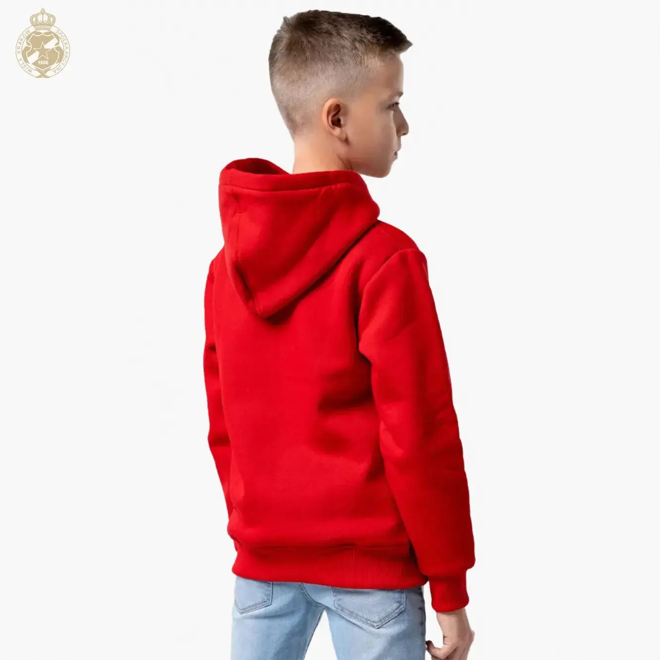Bluza dziecięca z kapturem w intensywnym czerwonym kolorze od Official FanShop - TS Wisła Kraków SA to praktyczny i stylowy wybór dla aktywnych dzieci. Łączy wygodę, trwałość i sportowy charakter, by towarzyszyć maluchom w szkole, na podwórku i poza nim.