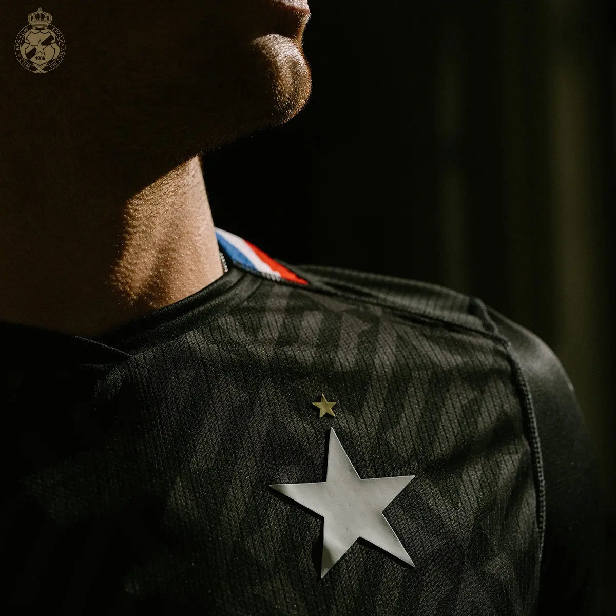 • Subtelny geometryczny wzór na czarnej tkaninie – nawiązanie do ducha Wierności, z klubowymi detalami.