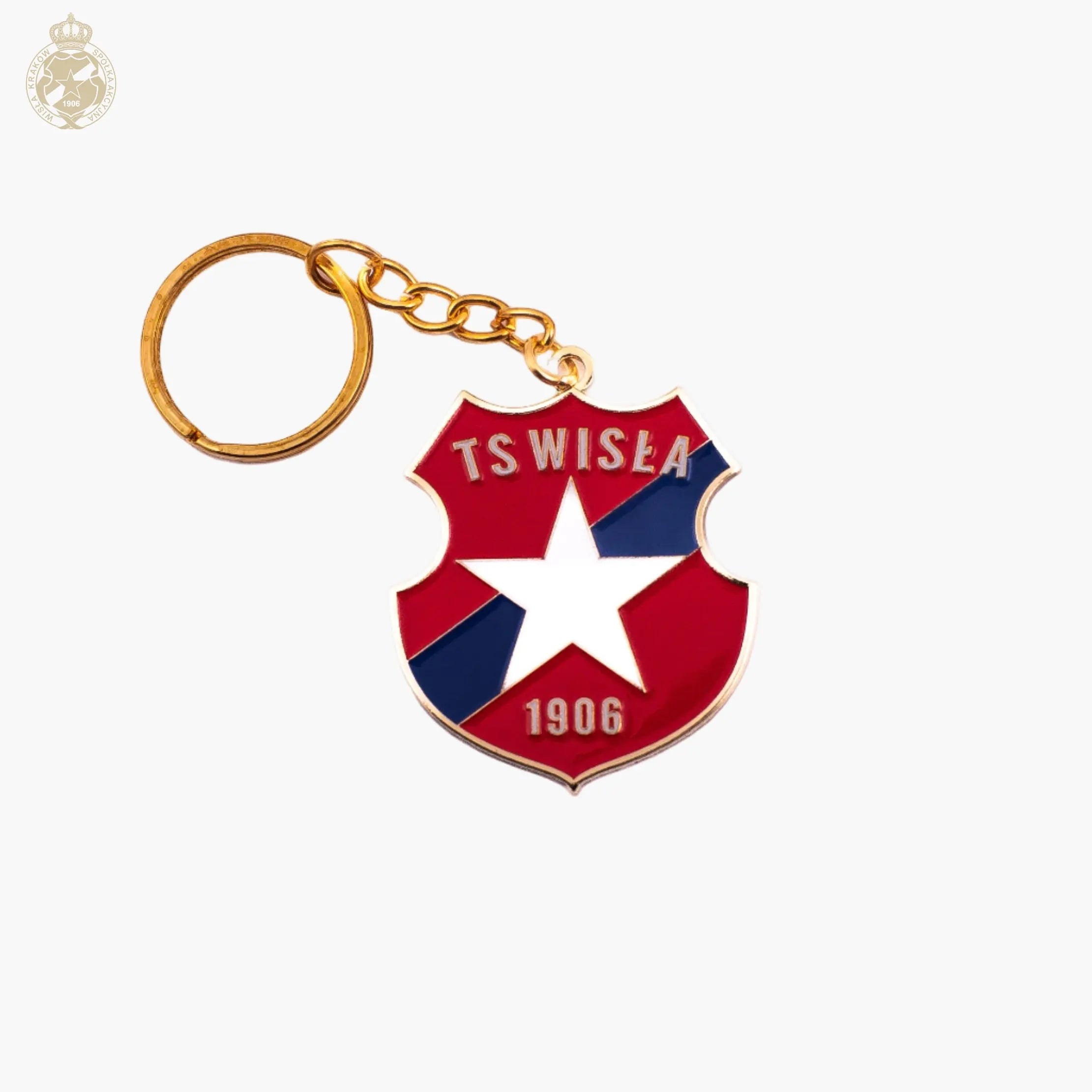 The elegant “TS Wisła” metal keyring is a perfect combination of fan passion and durable everyday practicality. Made of high-quality metal, it features the classic Wisła Kraków crest in the characteristic red and blue colors with a distinct white star, while the gold finish adds a prestigious, engraved shine. The date 1906 appears at the bottom of the crest, referencing the club’s long-standing tradition.