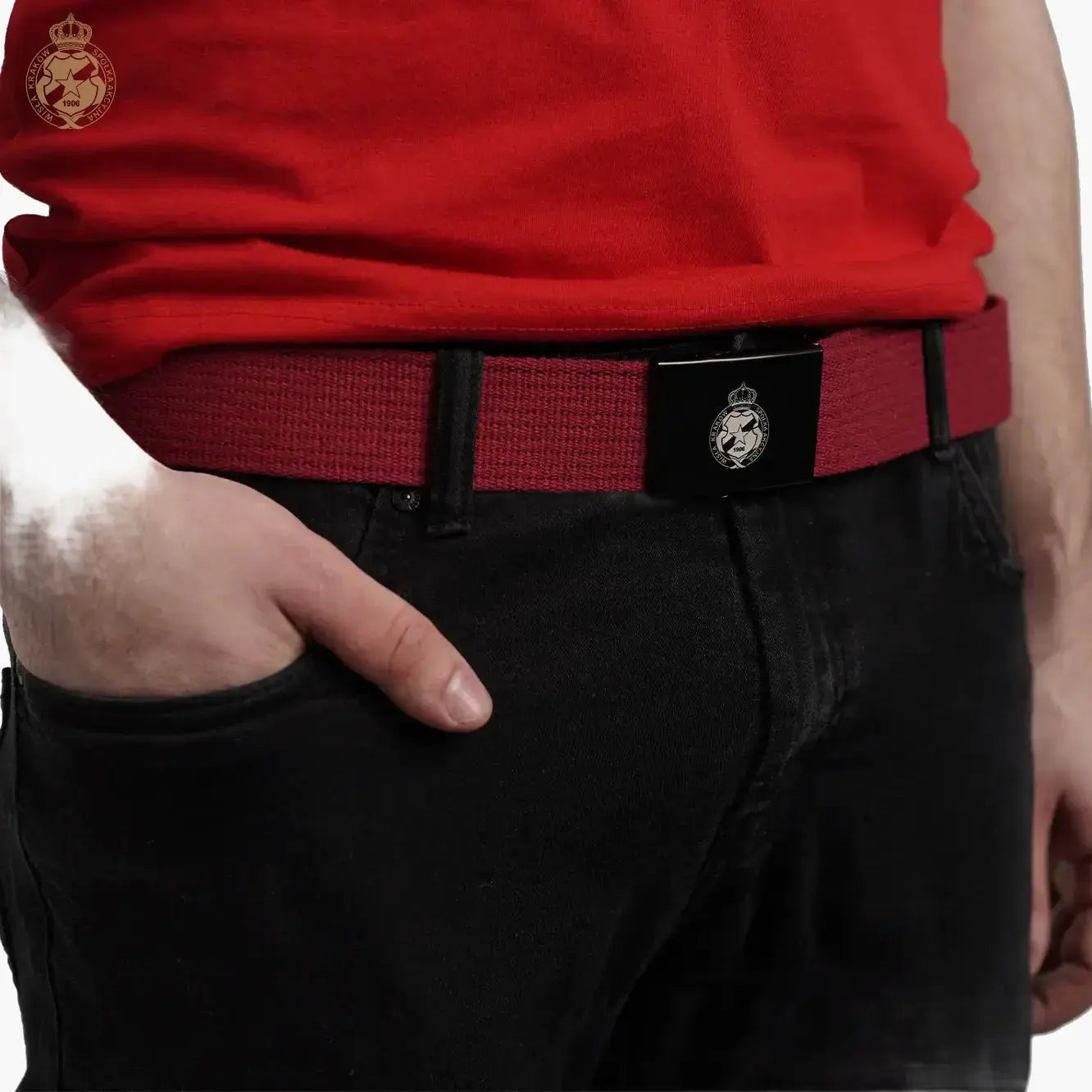 Pasek Herb - czerwony jest dostępny w Official FanShop – TS Wisła Kraków SA, co gwarantuje oryginalność, wysoką jakość i zgodność z klubową tradycją. Zamów już dziś i dodaj swojej garderobie stylowy, energetyczny akcent w barwach Białej Gwiazdy.