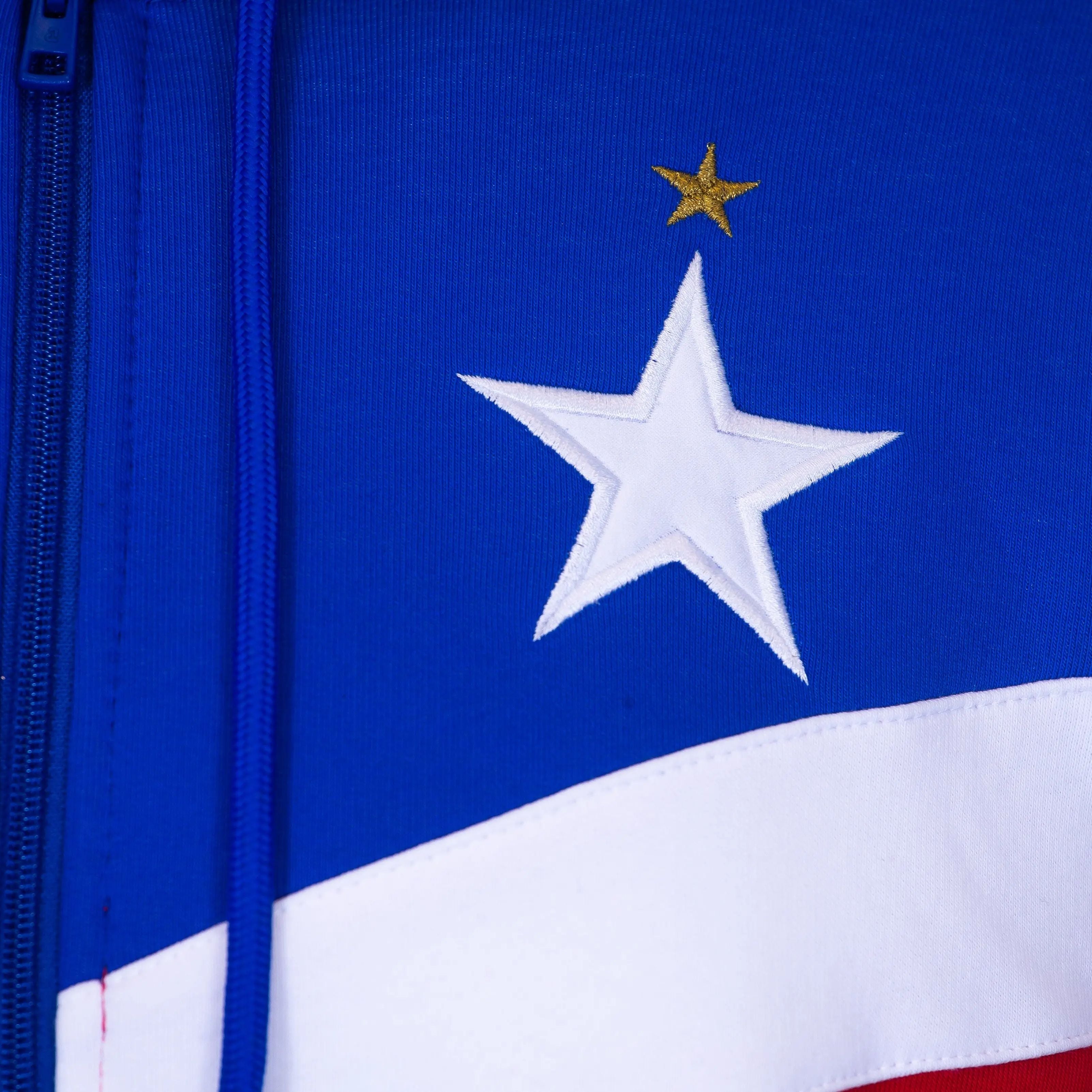 Góra bluzy i kaptur utrzymane są w intensywnym niebieskim odcieniu, na którym kontrastuje dynamiczny biały pas w kształcie litery V, a dolna część oraz rękawy dominują czerwienią. Na piersi widnieje emblemat z dużą białą gwiazdą, a nad nią subtelnie błyszczy złota gwiazdka – subtelny akcent, który podkreśla klubowy charakter ubrania. Długie, czerwone sznurki kaptura dopełniają całość, dodając sportowego sznytu i praktyczności.