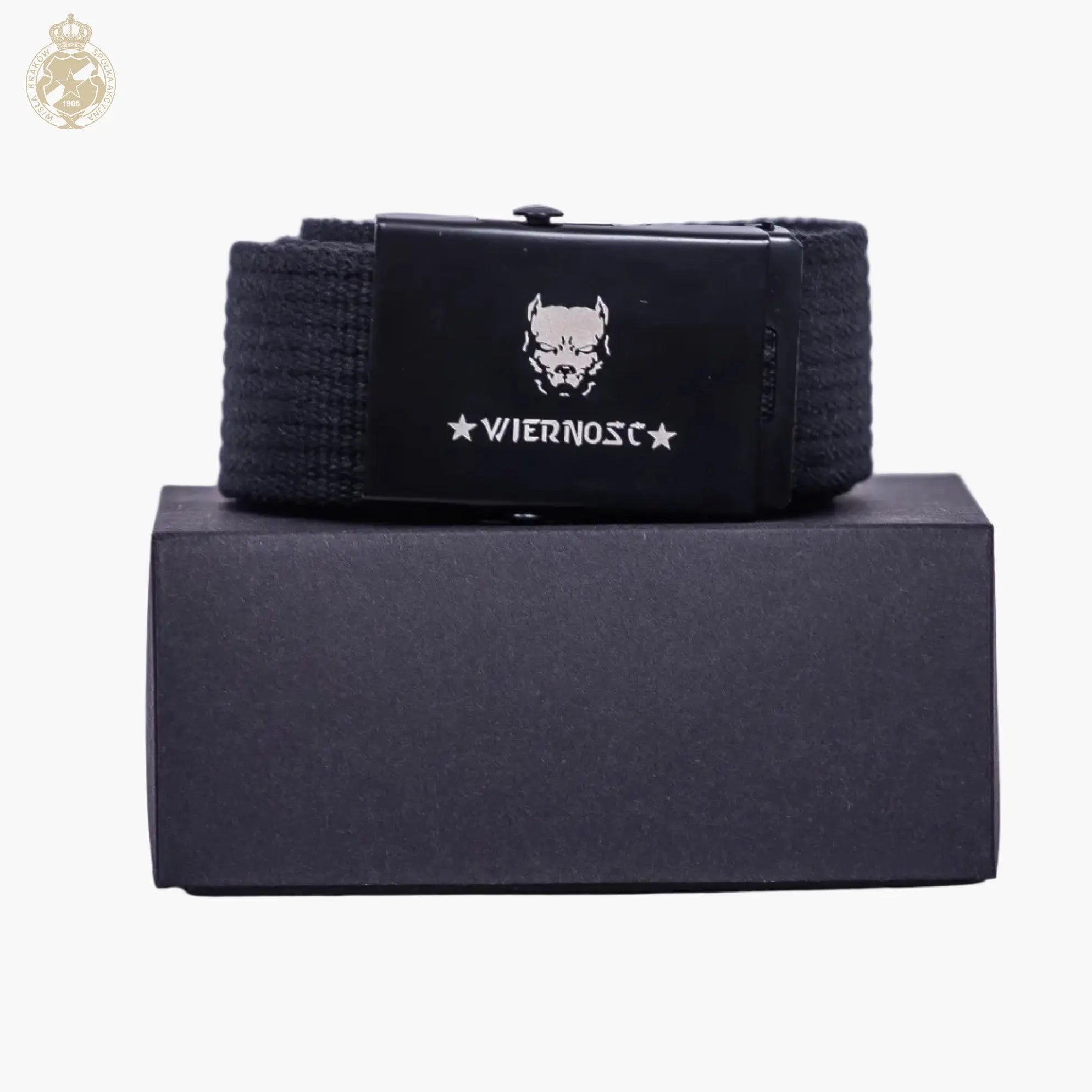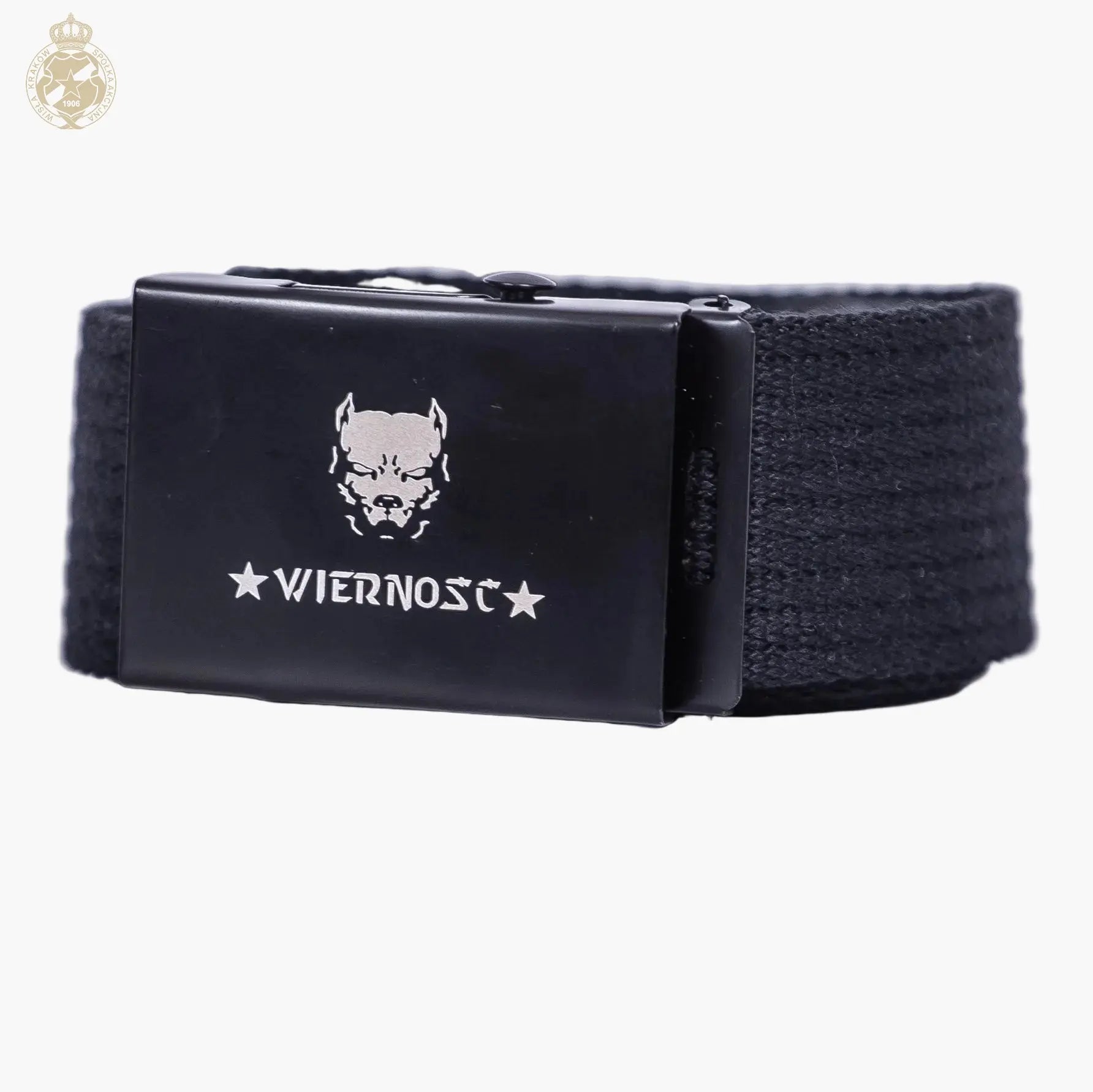 Металева пряжка з чітким написом «WIERNOŚĆ» та характерним клубним мотивом – тонкий акцент, що підкреслює прихильність до Вісли Краків без зайвої помпезності.